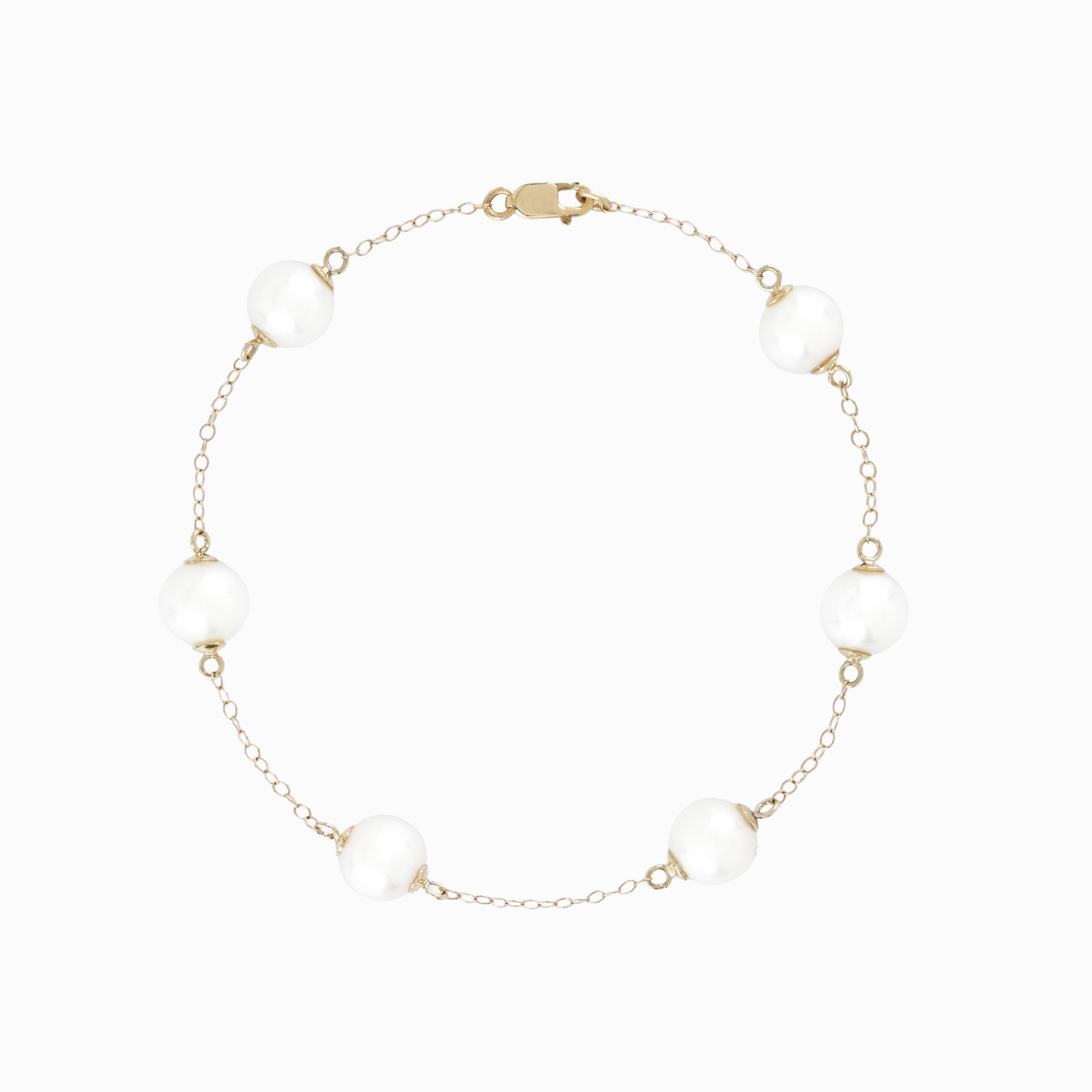 A fine 18k yellow gold chain traces the wrist, punctuated by round freshwater pearls spaced with deliberate rhythm. Each one distinct, each one suspended along a single line of tension.