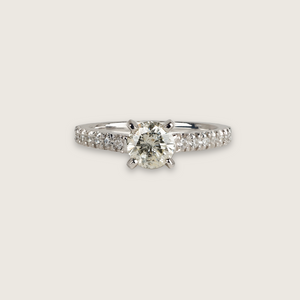 A quiet clarity. Lumen brings together the classic elegance of a six-prong solitaire with the delicate brilliance of a diamond pavé band. The natural warm white center stone, full of light and life, is gently lifted in a claw setting, allowing the facets to catch at every angle.