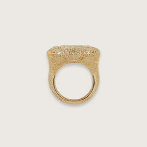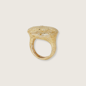 Flat-topped and richly textured, the Lunette Disc feels like a coin struck on another planet. Crystals glint from its cratered surface, catching light in quiet flashes. Crafted in 10k yellow gold, it’s made in size 6.5. A ring with presence, shaped for those who prefer their statement a little more grounded.