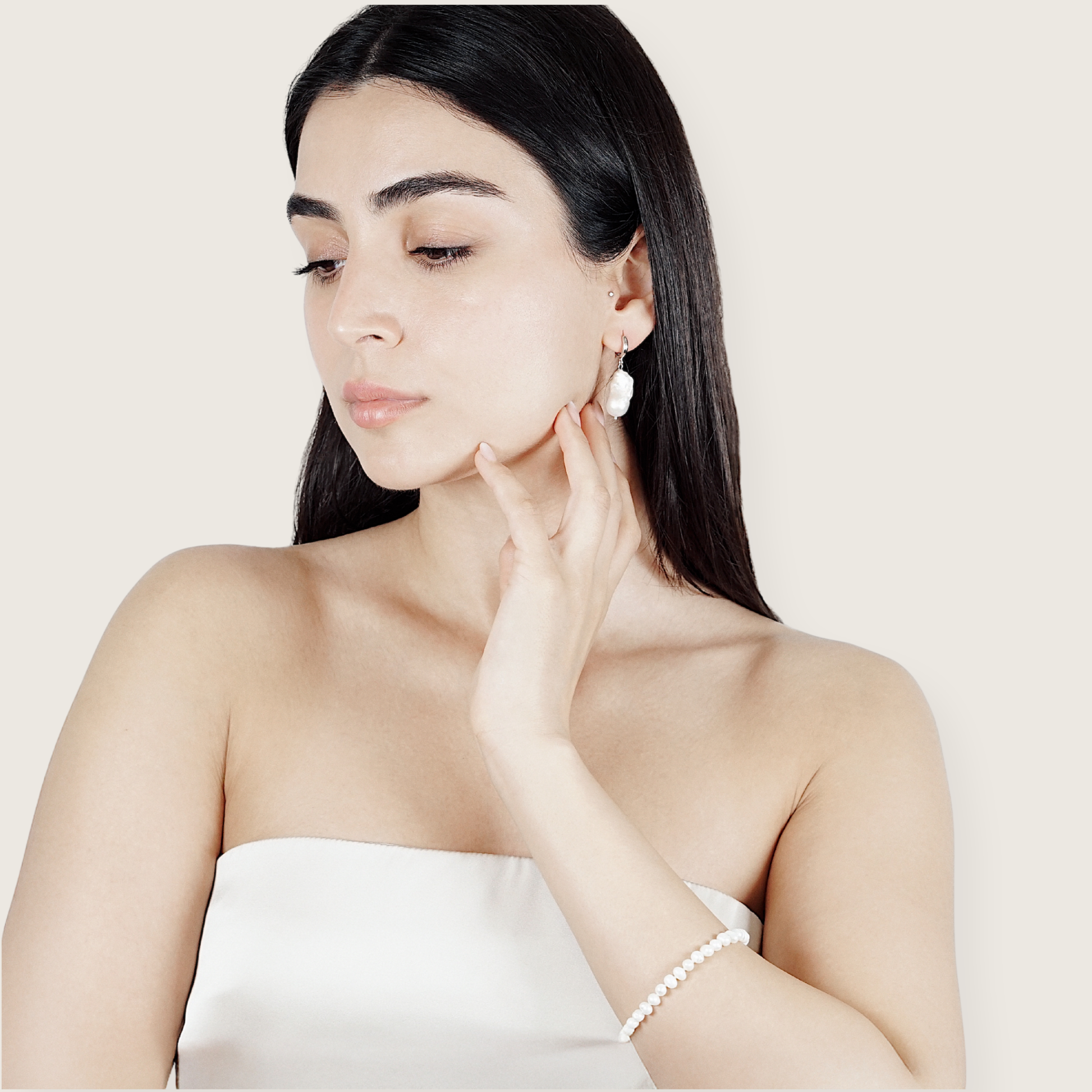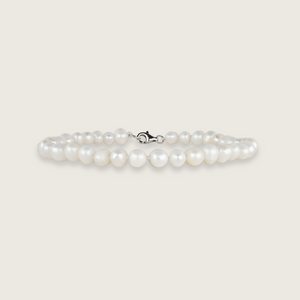 A dose without a diagnosis. The Off Label Bracelet strings together smooth, pill-shaped freshwater pearls, each one a little irregular: the intended side effect. At 7 inches, it rests lightly on the wrist, finished with sterling silver findings. Minimal effort, maximum efficacy.